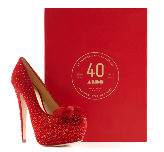 Il marchio di calzature e accessori Aldo compie quarant’anni e per l’occasione i festeggiamenti sono in grande. Per celebrare l’anniversario ha infatti creato una edizione speciale: si tratta di décolleté con tacco vertiginoso e plateau in rosso, tempestate di cristalli Swarovski.