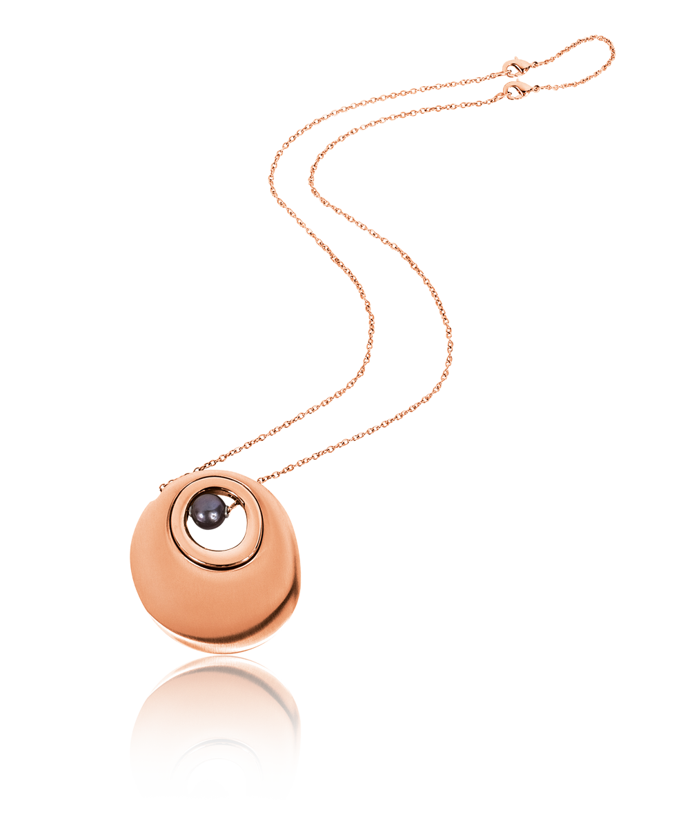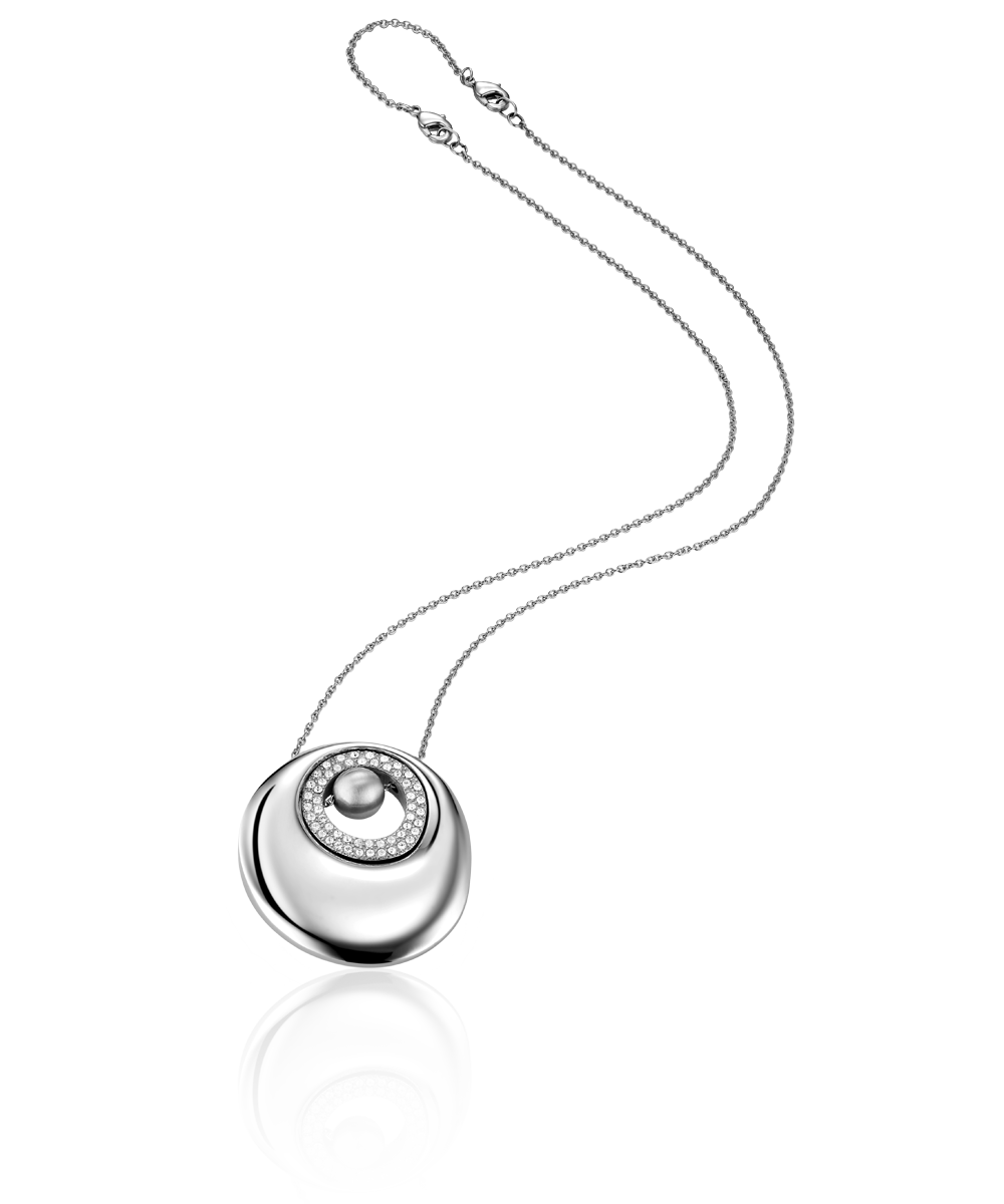 Look minimal per il doppio pendente in acciaio lucido con cristalli Swarovski e sfera in acciaio satinato. Il pendente è disponibile nelle versioni in luminoso acciaio con perla naturale bianca e caldo oro rosa con perla grigia.