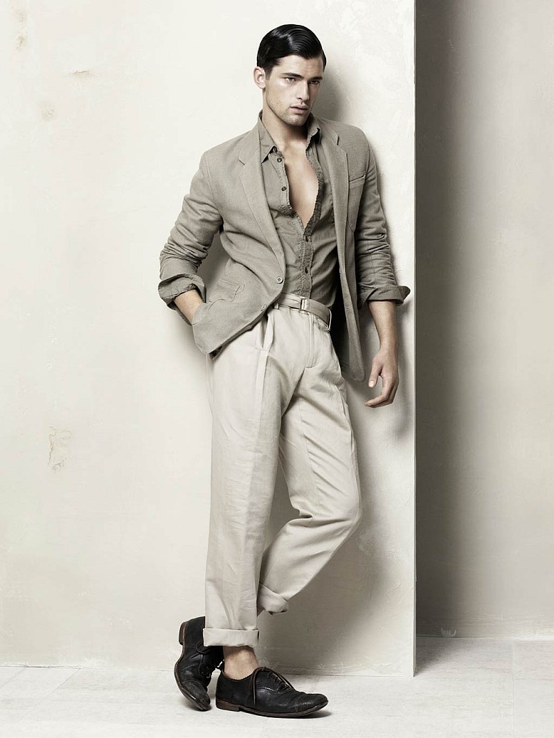 Pantaloni in cotone, camicie leggere, giacche in lino o gessate da giorno che possono essere sdrammatizzate e rese più giovanili se abbinate a jeans effetto used; poi t-shirt, giubbini con collo alla coreana, camicie in jeans, golfini abbottonati davanti, mocassini e stringate.