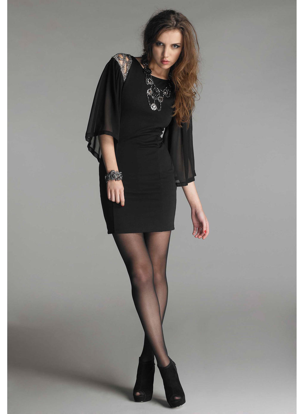 La collezione è composta da quattro completi, come le quattro protagoniste della serie tv. Un mini-dress nero in chiffon con applicazioni sulle spalle. Una jumpsuit in total black con pantaloni a palazzo a vita alta e una ricca decorazione color oro che funge da collana e che si allaccia dietro il collo lasciando la schiena scoperta.