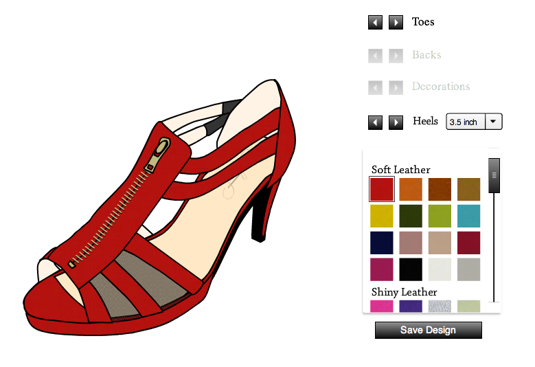 Una volta entrate nel sito cliccate su “start designing”. Scegliete il modello base tra quelle a punta tonda con o senza plateau, le ballerine, le zeppe, le classiche a punta e le gladiator. Poi scegliete colori e materiali tra le numerose proposte ed infine forma e altezza del tacco. Se lo desiderate, potete arricchire le scarpe con dei dettagli: fiocchi o nastrini sulla punta, rouges o cinturini alla caviglia. Ed il gioco è fatto!